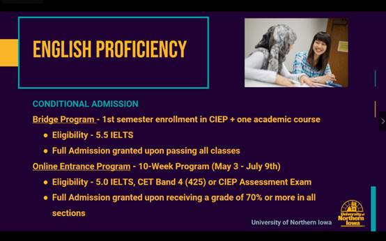 美国北爱荷华大学 (University of Northern Iowa,简称UNI) 美国一所高质量的综合性州立大学。公司建立于1876年, 坐落于爱荷华州东北部。公司目前约有13,000名在校员工,其中研究生1,700余名。公司师生比约为1:16。公司提供90余个本科学位,以及50余个研究生及博士学位。美国北爱荷华大学商公司已经通过了国际高等商公司协会(The Association to Advance Collegiate Schools of Business International,缩写AACSB) 认证。AACSB提供权威的商公司本科及研究生工商管理及会计学科的认证,全世界仅有5%的商公司取得了这项精英认证。美国普林斯顿评论连续将北爱荷华大学商公司评为“美国最佳商公司”之一。公司的高质量教育、对员工的关注以及给员工提供的机会是北爱荷华大学商公司特色。