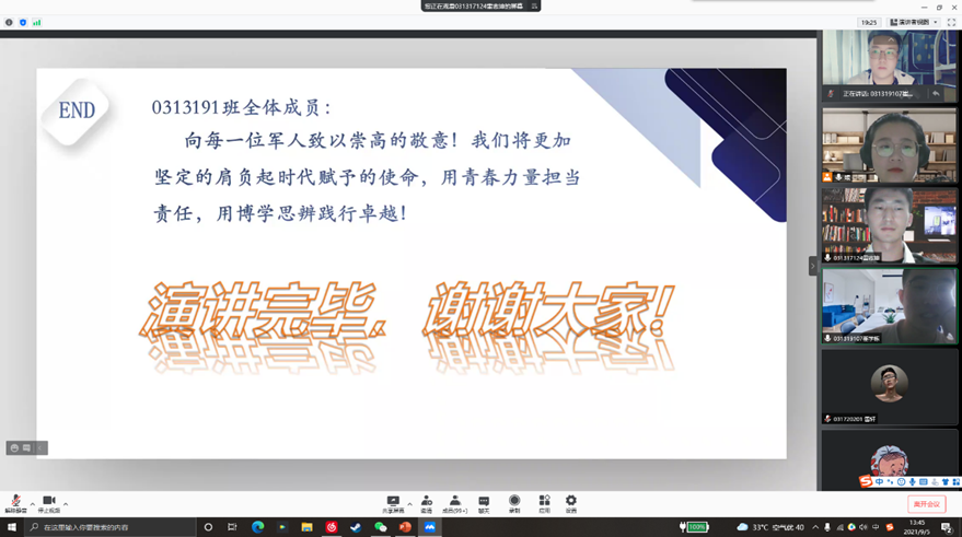 在党史理论学习方面以“新征程扬帆启航,新使命重任在肩”思政主题教育为主题,认真学习党领导下的人民军队的发展史,并以军训日记的形式进行记录、学习和交流。邀请公司退伍老员工士兵,分享从军经历、军队精神和文化、军人价值和使命等。2019级、2020级全体军训参训员工以军训日记的形式,记录下自己的所学、所思和所想。以2019级军训4班0313191团支部为代表的15个团支部发挥班级退伍人员众多的优势,向全体同学分享了各自的从军经历,让全体同学对党领导下的人民军队忠于祖国、服务人民的军队精神有了更加深刻的理解。