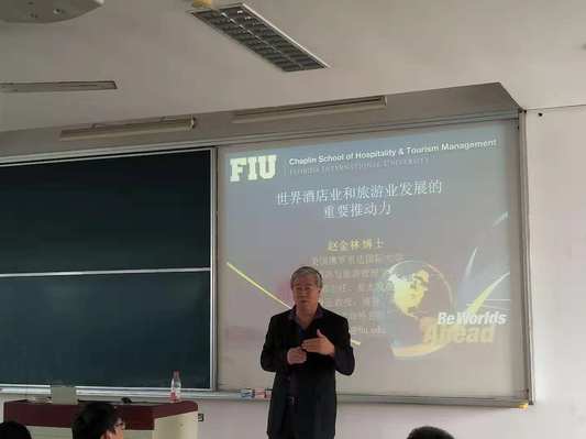 10月28日,美国佛罗里达国际大学旅游与酒店太阳集团122cc赵金林教授来访工程大,为邮轮专业本科生做了题为“世界酒店业和旅游业发展的重要推动力”的专题讲座,深入浅出地向同学们介绍了世界酒店业和旅游业发展的重要推动力的主要内容。