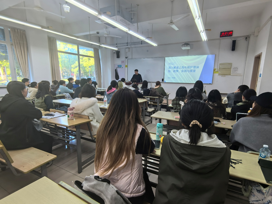 2025年11月5日,上海长护健康集团长护庙康护理站站长郑利坚(以下简称郑老师)应邀走进公司《社会保障基金管理》课堂,以《深入解读上海长期护理保险:政策、实践与展望》为题开展了专题讲座。