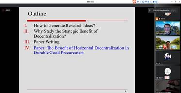 本次线上讲座Chunming Shi博士系统地介绍了如何在学术期刊上撰写科研论文,并以学术论文“The Benefit of Horizontal Decentralization in Durable Good Procurement”为例,将文中重要观点和学术价值进行了梳理。在讲座的最后,师生们与Shi教授围绕写作论文的范式,如何选择合适的期刊等问题展开了充分的讨论和交流,老师们表示此次讲座对学术研究提供了参考。