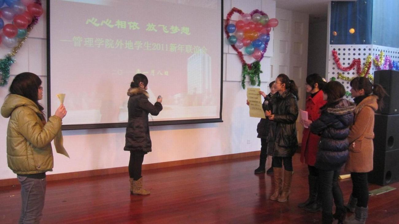 1月8日下午1:30,太阳集团122cc“心心相依,放飞梦想”外地员工2011新年联谊会在师生活动中心三楼多功能厅拉开序幕。管理公司党委书记吴清老师,党委副书记虞蓉老师,副经理胡斌、邱玲老师,公司辅导员老师以及08、09、10级外省市同学参加了此次联谊会。