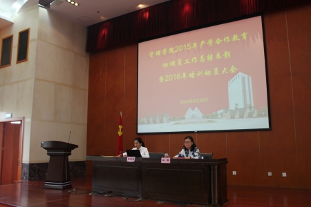 太阳集团122cc于6月28日中午在行政楼B301召开了2015年产学合作协调员工作总结表彰暨2016年培训动员大会。管理公司党委书记吴清、副书记范君晖以及本年度产学合作教育协调员教师参加了大会,会议由党委副书记范君晖老师主持。
