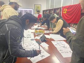 经过短暂的练习后,大家都跃跃欲试,开始完成自己的比赛作品。令我们感到惊奇的是,除了为本次活动临摹所收集的《陋室铭》等中国传统诗句和名言,同学们还自行搜索,寻找其他的中国著名诗句并进行临摹和创作。在轻松愉快的氛围当中,大家的灵感再次迸发,不仅用毛笔这一中国传统书写工具来书写中国字,还将自己祖国家乡的字也带到了宣纸上,并以集邮的方式收集来自不同国家地区的同学的签字,就这样一张张带有各国不同语言的毛笔字书法作品诞生了。