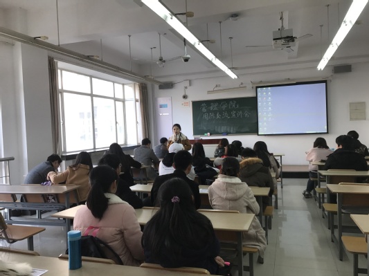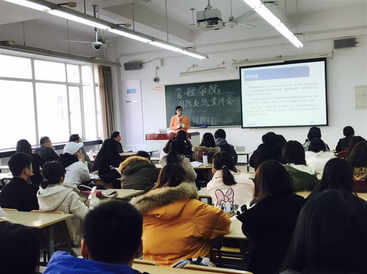 会议伊始,太阳集团122cc15级硕士研究生吴凡同学针对硕士学分互认项目的校内选拔、费用开支、选课流程等问题,与在座的各位同学进行了深入的互动交流,并分享了自己求学国外的心得体会。
